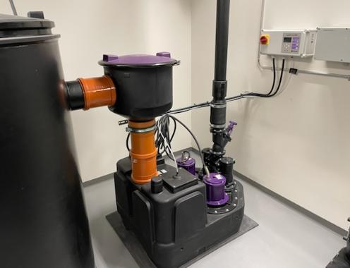 Derudover valgte bygherre en Sonic Control niveaumåler, som måler og registrerer fedtlagets tykkelse i udskilleren, og når udskilleren når et max-niveau, sender Sonic Control alarmboks en besked over bygningens CTS-anlæg, således vicæeværten er orienteret om og kan planlægge, hvornår slamsugeren skal tømme udskilleren.