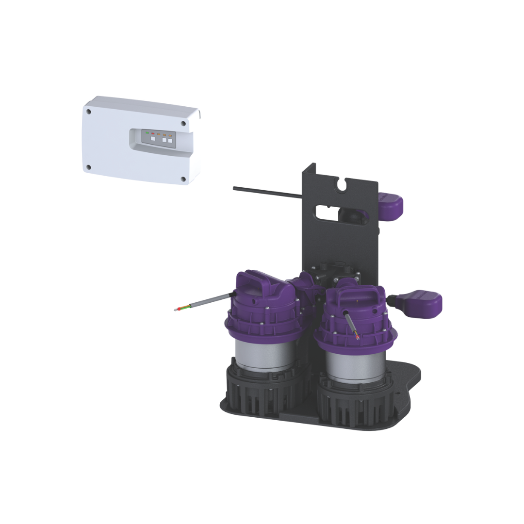 Pumpesystem til eftermontering i opsamlingstank for spildevand uden fækalier. Duo-anlæg med to GTF 1000-dykpumper, to tilbageløbsventiler og Connect Duo styreenhed med batteribackup, niveaustyring og alarmfunktion.