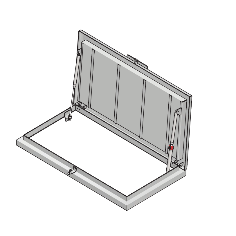 Uponor dæksel, aluminium, overfalset, rammeprofil B2 50x45x50 mm, til eftermontering, indvendige mål ramme 600 x 1200 mm, gasfjeder med spærring i åben position, låseøje til hængelås, isoleret, gummiliste, lakeret i RAL 7037, grå.