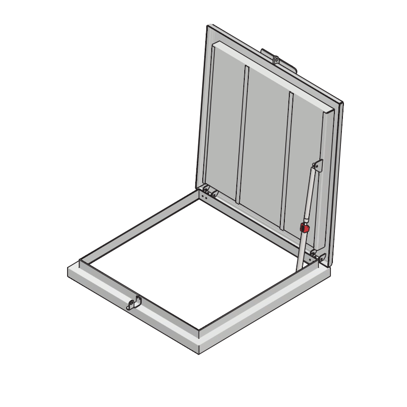 Uponor dæksel, aluminium, overfalset, rammeprofil B2 50x45x50 mm, til eftermontering, indvendige mål ramme 800 x 800 mm, gasfjeder med spærring i åben position, låseøje til hængelås, isoleret, gummiliste, lakeret i RAL 7037, grå.